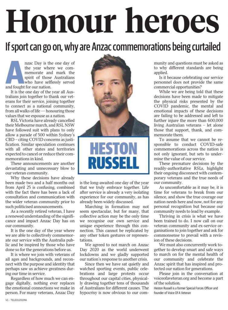 RSL Victoria have already cancelled their Melbourne march, and RSL NSW have followed suit with plans to only allow a parade of 500 within Sydney’s CBD – citing COVID concerns as justification. Similar speculation continues with all other states and territories expected to cancel or reduce their commemorations in kind.